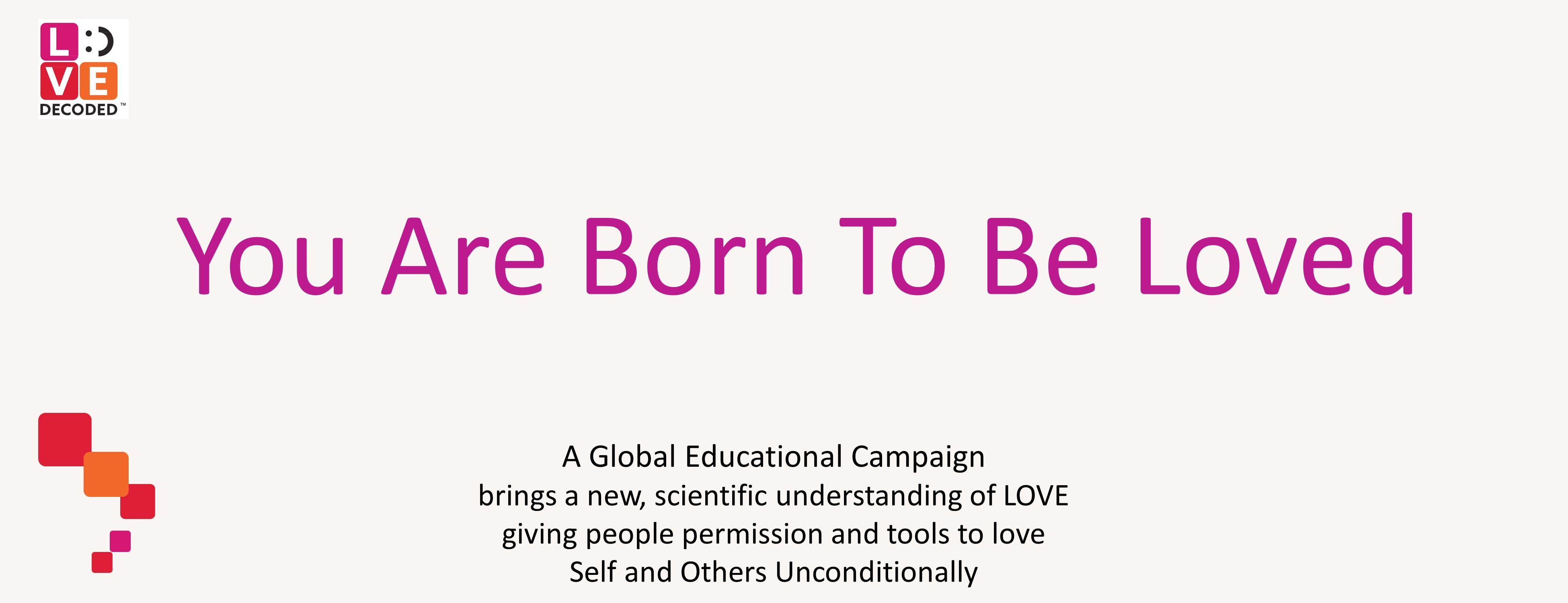 Continue to educate yourself about love and become part of our Global Education Campaign for this important effort. Your financial contributions to support this ‘labor of love’ effort, can be made at - GoFundMe – click -https://www.gofundme.com/manage/You-Are-Born-To-Be-Loved-THE-LOVE-DECODED-APP